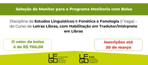 EDITAL DE SELEÇÃO DE MONITOR PARA O PROGRAMA MONITORIA COM BOLSA PARA O SEMESTRE DE 2024-1 PARA A DISCIPLINA – ESTUDOS LINGUÍSTICOS I: FONÉTICA E FONOLOGIA – DO CURSO DE LETRAS LIBRAS, COM HABILITAÇÃO EM TRADUTOR/INTÉRPRETE EM LIBRAS – EAD – UFGD