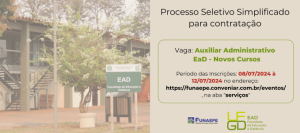 Processo Seletivo para Contratação de Auxiliar Administrativo Vaga: Auxiliar Administrativo EaD – Novos Cursos Período das Inscrições: 08/07/2024 a 12/07/2024 no endereço https://funaepe.conveniar.com.br/eventos/ , na aba “serviços” Clique aqui para mais informações