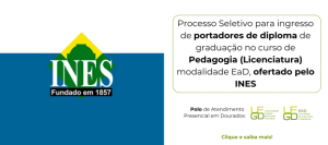 Edital 07/2024 – Processo Seletivo para ingresso no curso de Pedagogia (Licenciatura) modalidade a distância para portadores de diploma de graduação A Diretora-Geral do Instituto Nacional de Educação de Surdos – INES, no uso de suas atribuições legais e regimentais, torna público o presente edital, contendo normas, rotinas e procedimentos necessários à realização do Processo… Continue lendo Processo Seletivo para ingresso no curso de Pedagogia (Licenciatura) modalidade a distância para portadores de diploma de graduação do INES