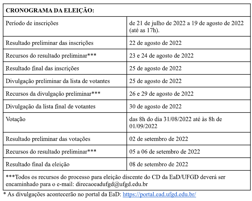 ● A votação para eleição discente no CD acontecerá online e o link será disponibilizado no portal da EaD: https://portal.faead.ufgd.edu.br/