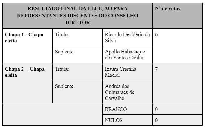 InícioConsultas PréviasRESULTADO FINAL DA ELEIÇÃO PARA REPRESENTANTES DISCENTES DO CONSELHO DIRETOR RESULTADO FINAL DA ELEIÇÃO PARA REPRESENTANTES DISCENTES DO CONSELHO DIRETOR Publicado em 31 de outubro de 2023