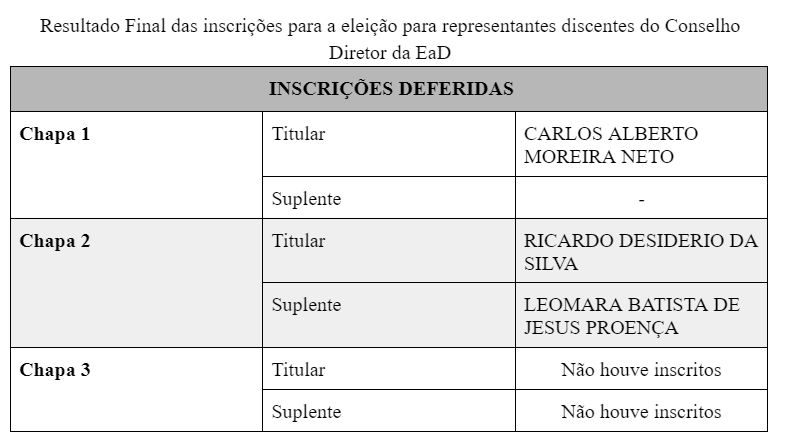 InícioNotíciasResultado Final das inscrições para a eleição de representantes discentes do Conselho Diretor da EaD Resultado Final das inscrições para a eleição de representantes discentes do Conselho Diretor da EaD Publicado em 7 de outubro de 2022