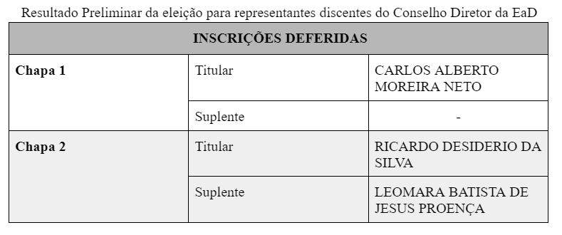 InícioNotíciasResultado Preliminar das inscrições da eleição para representantes discentes do Conselho Diretor da EaD Resultado Preliminar das inscrições da eleição para representantes discentes do Conselho Diretor da EaD Publicado em 4 de outubro de 2022