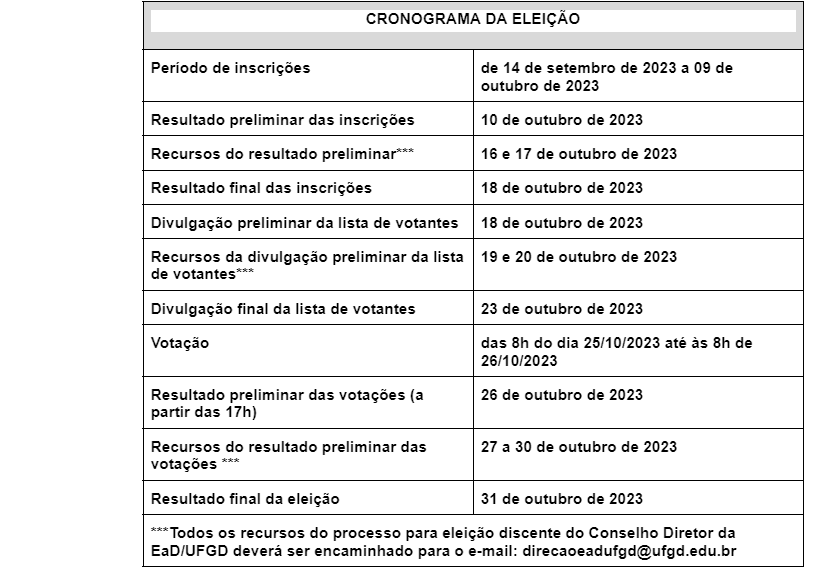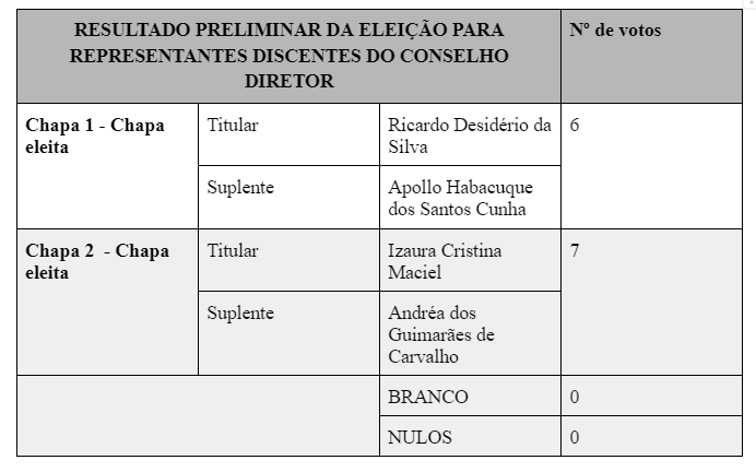 InícioConsultas PréviasRESULTADO PRELIMINAR DA ELEIÇÃO PARA REPRESENTANTES DISCENTES DO CONSELHO DIRETOR RESULTADO PRELIMINAR DA ELEIÇÃO PARA REPRESENTANTES DISCENTES DO CONSELHO DIRETOR Publicado em 26 de outubro de 2023