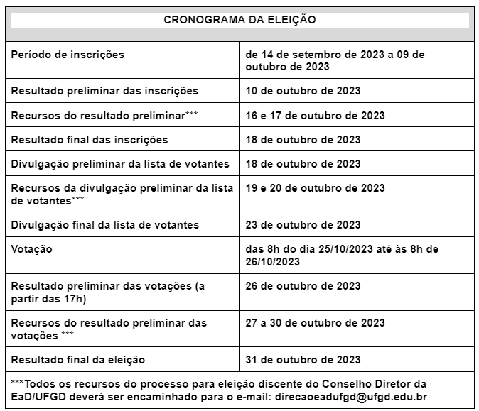 InícioConsultas PréviasResultado preliminar das inscrições para a eleição para representantes discentes do Conselho Diretor da EaD Resultado preliminar das inscrições para a eleição para representantes discentes do Conselho Diretor da EaD Publicado em 10 de outubro de 2023 *As divulgações acontecerão no portal da EaD: https://portal.faead.ufgd.edu.br/